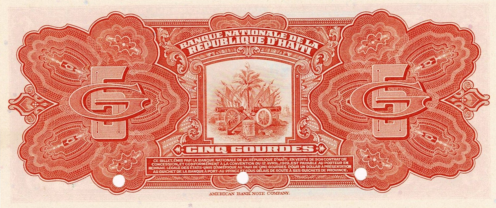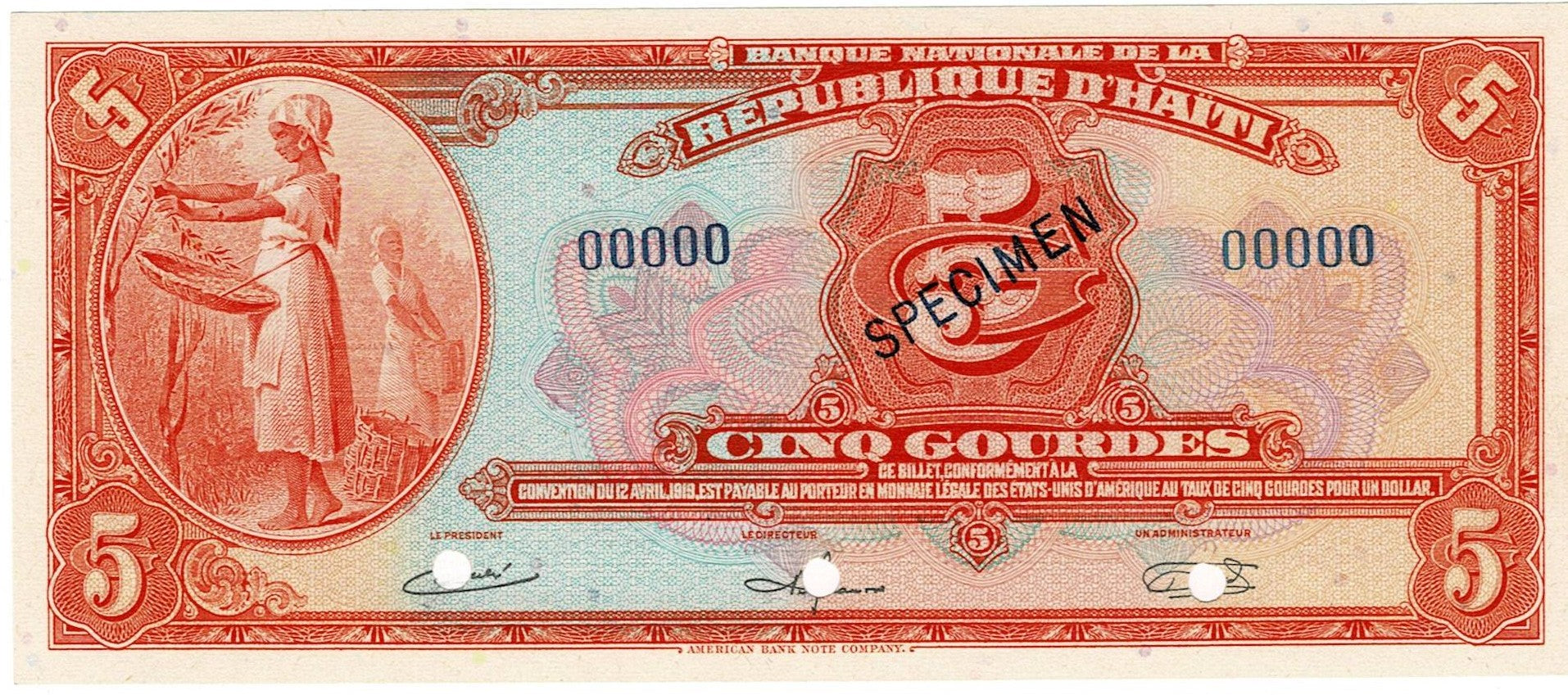 Haiti / P-187s / 5 Gourdes / L 1919 / SPECIMEN